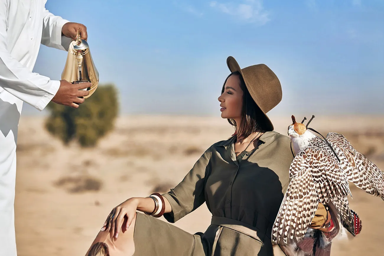 Upon arrival, guests are welcomed with traditional coffee, dates, and snacks. Relax in the luxurious desert setting, enjoy henna tattooing, falcon photography, and unwind at the Sheesha lounge.