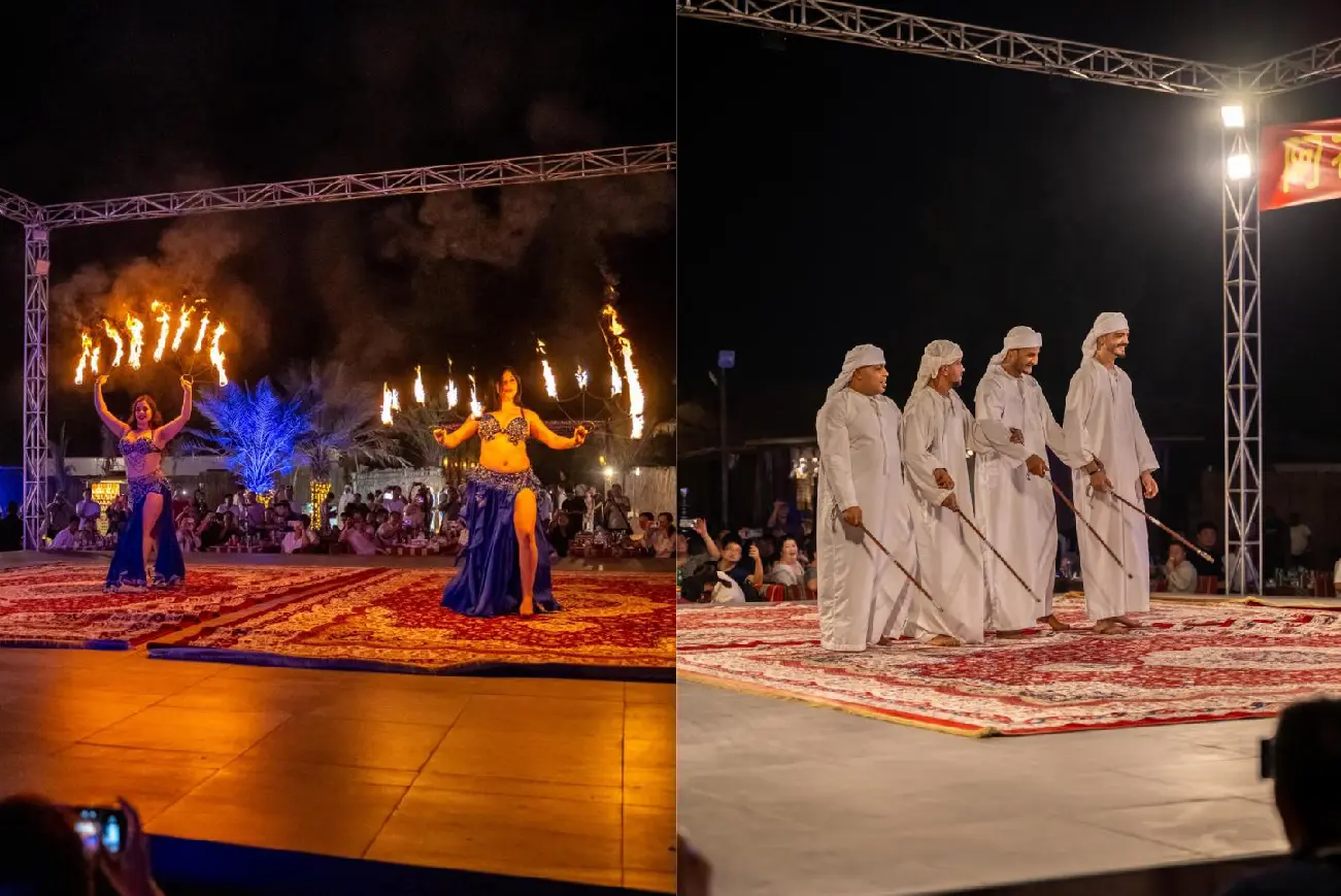 Indulge in a mouthwatering BBQ buffet with a variety of vegetarian and non-vegetarian dishes. The meal is followed by captivating live performances, including Tanoura Dance, Belly Dance, and a thrilling Fire Show. After dinner, relax with sheesha in the camp, enjoying the serene desert surroundings.