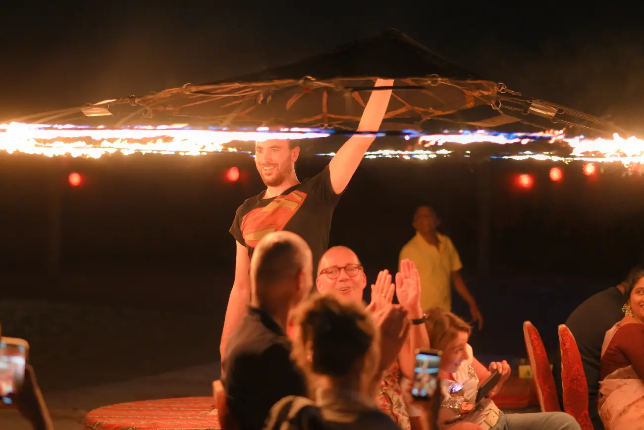 Indulge in a premium BBQ buffet with a variety of dishes that cater to all tastes. Enjoy vegetarian and non-vegetarian options, along with fresh salads and delicious desserts. After dinner, sit back and enjoy captivating live performances such as Tanoura Dance, Belly Dance, and a thrilling Fire Show.
